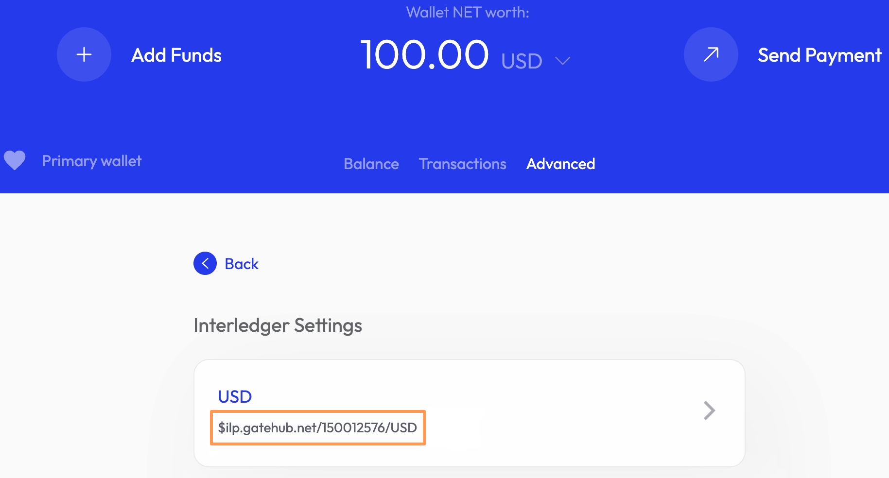 User's wallet address highlighted on the Interledger Wallet home screen